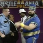 10-9-8-7-6-5-4-3-2-1….buzzzzz. It’s Andre The Giant. Meanwhile, Ax and Smash are still battling in the ring. When Andre finally enters the ring, Ax and Smash have a quick word and begin to team up to eliminate The Giant.
